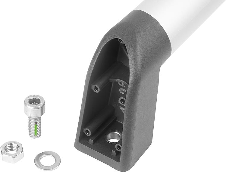 DescripciónDescripción del producto:La empuñadura de tubo Bighand recién diseñada permite una sujeción segura y cómoda gracias a su forma de empuñadura ovalada ergonómica y a los tamaños de tubo seleccionados. Impresiona por su diseño perdurable y elegante y se adapta de manera óptima al entorno mediante el diseño de color variable.Material:Tubo ovalado de aluminio. Piezas finales de poliamida termoplástica. Caperuzas protectoras de poliamida termoplástica. Casquillos receptores de acero inoxidable.Versión:Tubo ovalado en gris antracita con recubrimiento de polvo (brillante), anodizado negro (mate) y anodizado natural (mate. Piezas finales gris antracita RAL 7021. Caperuzas protectoras en gris antracita RAL 7021, naranja puro RAL 2004, amarillo colza RAL 1021, rojo tráfico RAL 3020, verde señal RAL 6032 y azul tráfico RAL 5017.Indicación de pedido:Δ Añadir el código de color deseado en este espacio.Indicación:El material de fijación no está incluido en el volumen de suministro. Para una retención segura y duradera se recomienda el tornillo de cabeza cilíndrica con hexágono interior y seguro de rosca. Rango de temperatura:Temperatura de uso continuo máx. 100 °C. Temperatura de uso a corto plazo máx. 180 °C.Montaje:La forma de construcción de los extremos está realizada de manera que sea posible la fijación de la empuñadura de tubo desde la parte de manejo o desde la parte trasera. Para ello están previstos tornillos de cabeza cilíndrica DIN con hexágono interior o tornillos hexagonales en el tamaño de la rosca M8. Después del montaje se pueden presionar las caperuzas protectoras con la mano. En las caperuzas protectoras hay ranuras en ambos lados para permitir un desmontaje sin destrucción con un destornillador. A petición:Distancia del eje "A" en longitudes especiales escalonadas.Accesorios:07160 Tornillos de cabeza cilíndrica con hexágono interior, DIN 912 / DIN EN ISO 4762 con seguro roscado 07160 Tornillos de cabeza cilíndrica con hexágono interior, DIN 912 / DIN EN ISO 4762 07171 Tornillos hexagonales DIN 933 / DIN-EN-ISO 4017 07210 Tuercas hexagonales DIN 934 / DIN EN ISO 4032 / DIN EN 24032 07300 Arandelas DIN 125 / DIN EN ISO 7089 forma ACaracterísticas especiales: DescargarAquí figura información recopilada en formato PDF: