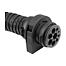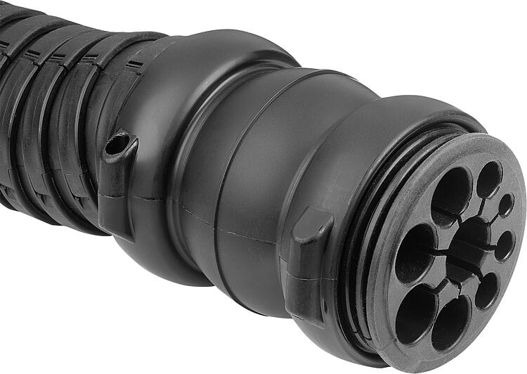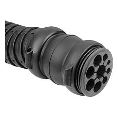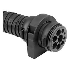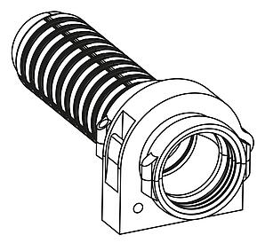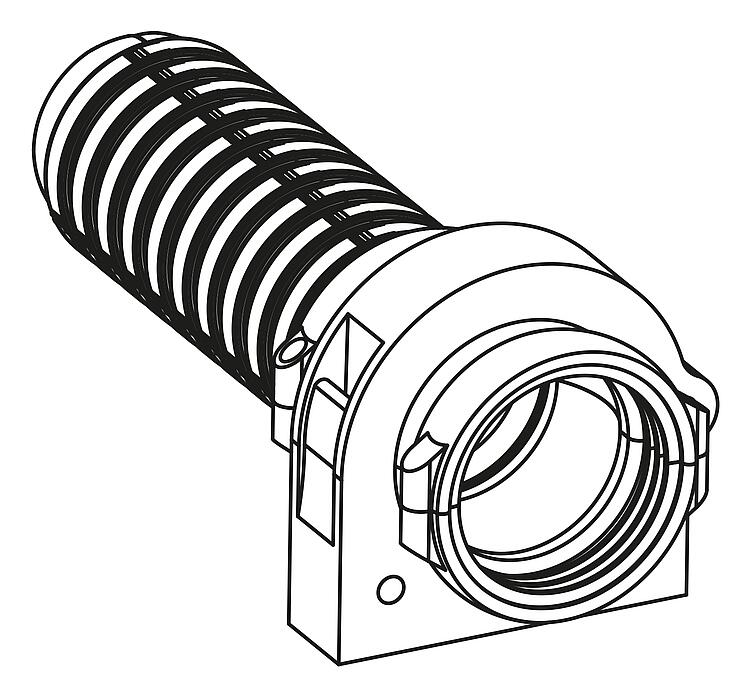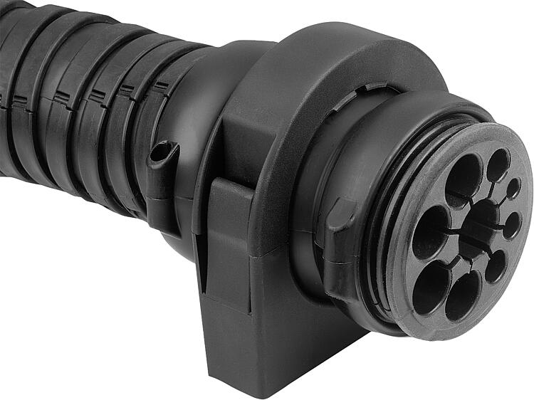 La cadena portacables/tubo corrugado mantiene su capacidad de giro en el adaptador. El pasacables se sujeta contra él.