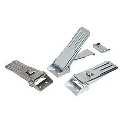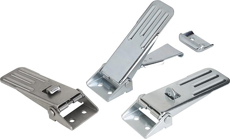 Cierres acodados de acero o acero inoxidable con estribo de chapa hasta 4000N, ajustables, perforaciones atornilladas visibles, versión larga, forma B, con seguro