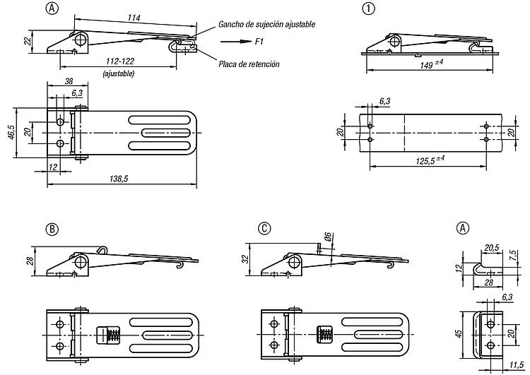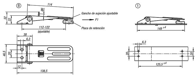 La fuerza de retención F1 se refiere al cierre acodado, no a la placa de retención.Accesorios:Placa de retención 05545.Indicación sobre el dibujo: