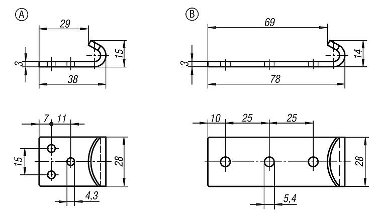 Placas de retención para cierres acodados con brida de sujeción triangular hasta 6500N, ajustables, forma B