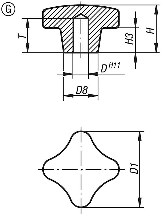 Empuñaduras en cruz similares a DIN 6335, forma G con agujero ciego