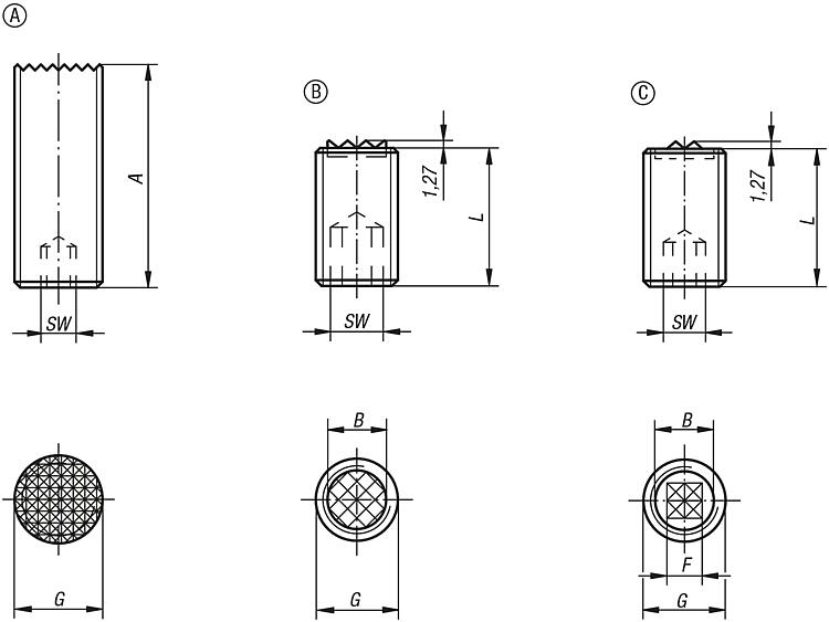 Forma A: Acero para herramientas Forma B: Acanaladura de metal duro Forma C: Acanaladura de 4 puntos de metal duro