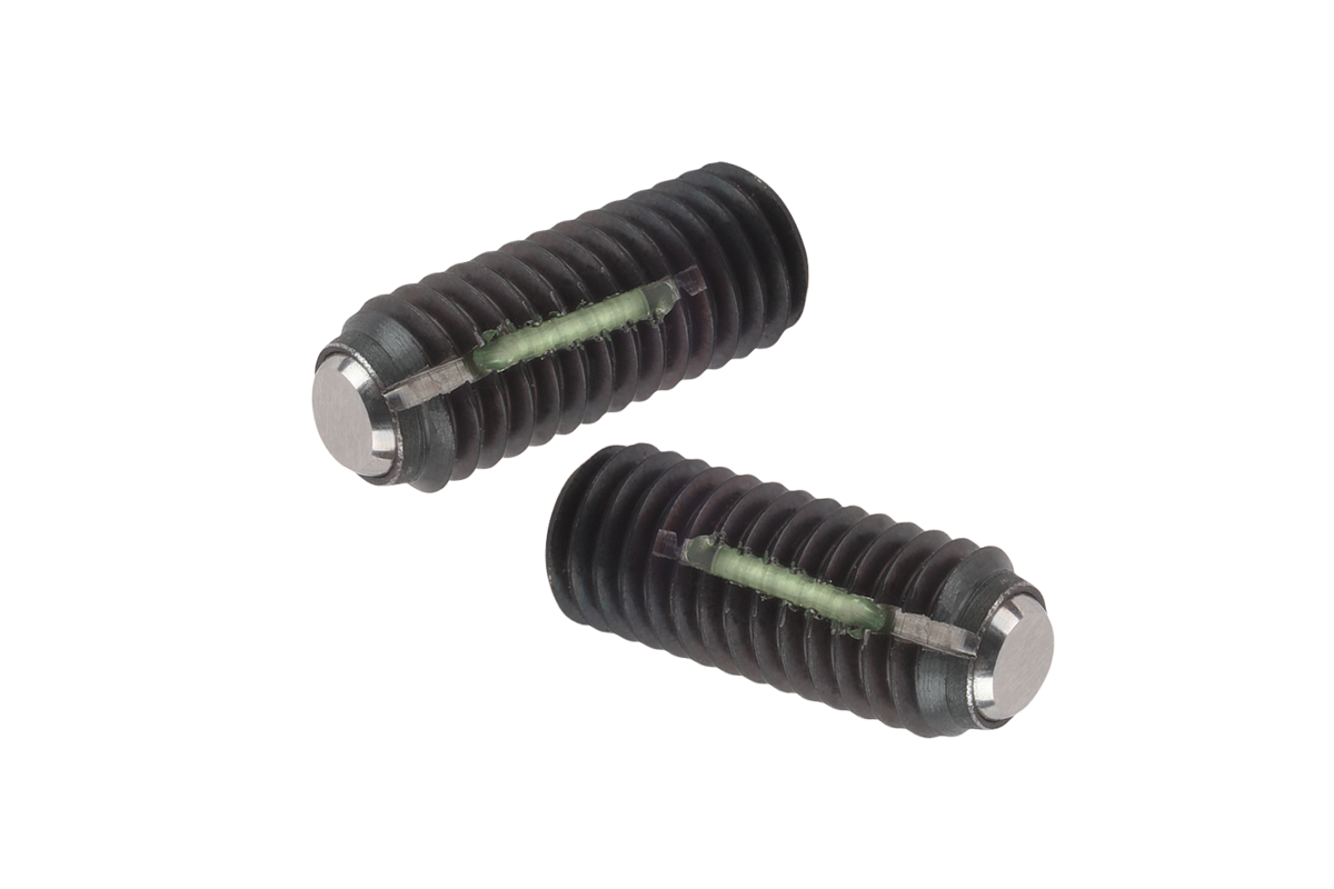 Tornillos de presión esféricos sin cabeza y con bola aplanada, con seguro roscado