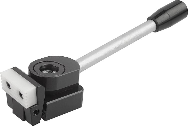 DescripciónMaterial:Acero.Versión:Templado por cementación y bruñido.Indicación:El dispositivo de sujeción con leva es un elemento de sujeción rápida que sirve para presionar piezas de trabajo sobre los topes fijos y sobre un soporte simultáneamente a través de una mordaza pivotante y de una excéntrica en espiral. El dispositivo de sujeción con leva se puede posicionar y sujetar con el casquillo de centrado (ver plano) sobre un sistema de retícula modular.