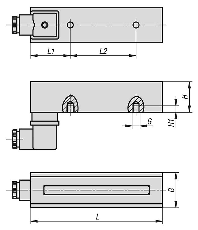 Los electroimanes se fijan mediante la rosca de la parte posterior. Varía el número de taladros roscados que tienen. La distancia L2 es la distancia respectiva entre las perforaciones roscadas. La conexión de alimentación se realiza a través del conector de válvula DIN conforme a la norma EN 175301-803 (antes DIN 43650). En este se instalan PINs para fijar directamente los filamentos.