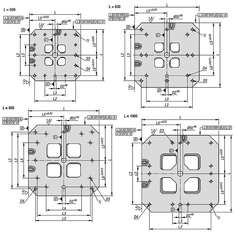 Indicación:Los centradores con superficies de sujeción mecanizadas previamente ofrecen la posibilidad rápida y rentable de realizar perforaciones individuales específicas en los cuerpos de base. El pie está acabado para el montaje en la mesa de máquinas. Las cuatro superficies de sujeción pueden ser fabricadas sobre la medida final por parte del cliente. Los centradores se adaptan a mesas de máquinas para máquinas-herramienta según DIN55201 y JIS6337-1980.
