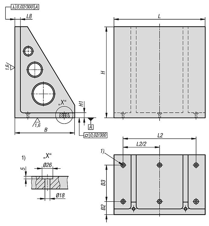 DescripciónMaterial:GJL 300.Versión:Superficies de apoyo y superficies de sujeción con mecanizado de precisión.Indicación:Las escuadras de sujeción son adecuadas para posicionar verticalmente y fijar las piezas de trabajo y los dispositivos. Las escuadras de sujeción con superficies de sujeción mecanizadas previamente ofrecen la posibilidad rápida y rentable de practicar perforaciones de retícula o individuales específicas en los cuerpos de base. El suministro incluye tornillos con ojo para el transporte.Indicación sobre el dibujo: