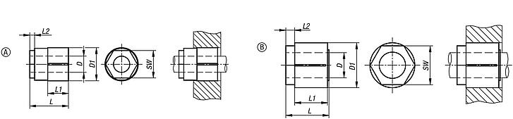 | Referencia | Forma | D | D1 | L | L1 | L2 | SW | Con par de apriete MS Momento de torsión transmisible M Nm | Con par de apriete MS Fuerza axial transmisible F kN | Presión superficial en el cubo P N/mm² | Par de apriete de los tornillos de sujeción MS Nm | CAD | Acc. | Precio | Pedir |