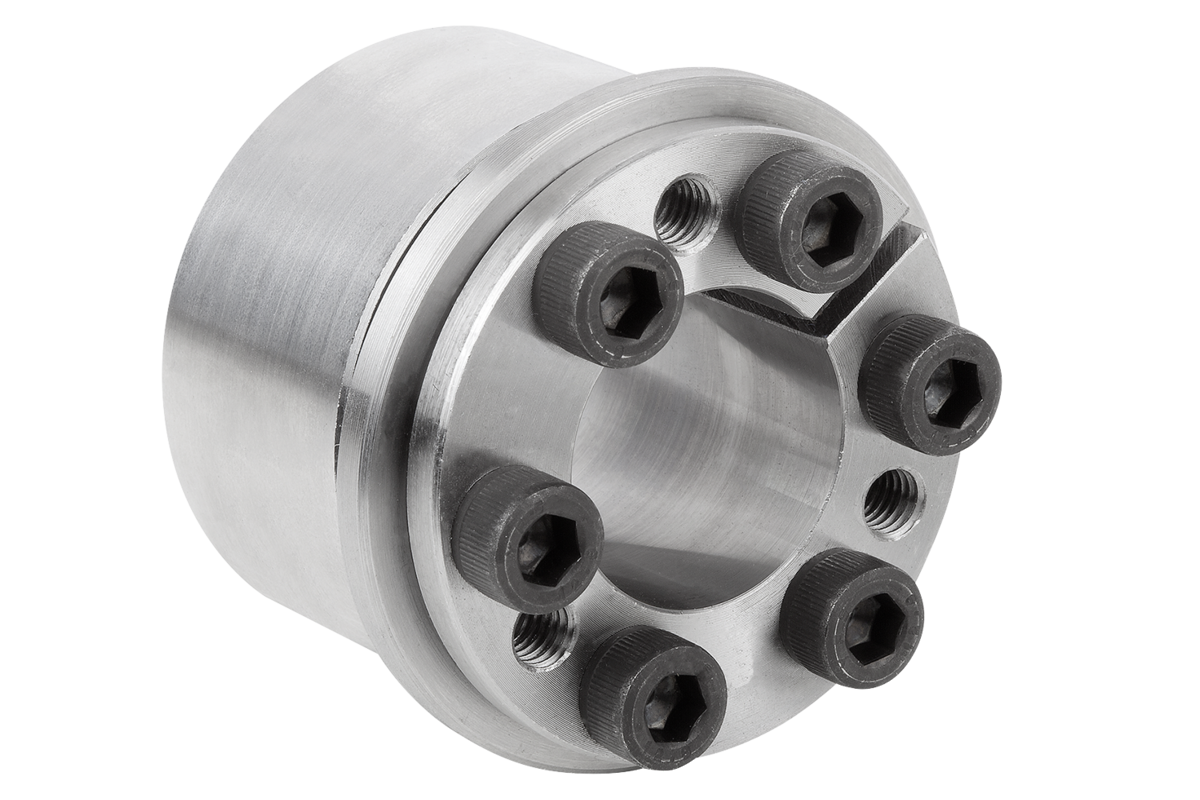 Montaje:Aplicar una capa ligera de aceite en las superficies cónicas del juego de dispositivo de sujeción y en los puntos de contacto del árbol y el cubo. No utilizar MoS2 ni grasa. Introducir el juego de dispositivo de sujeción en la base del cubo y deslizar en el árbol. Apretar el tornillo en cruz por etapas al par de apriete indicado.