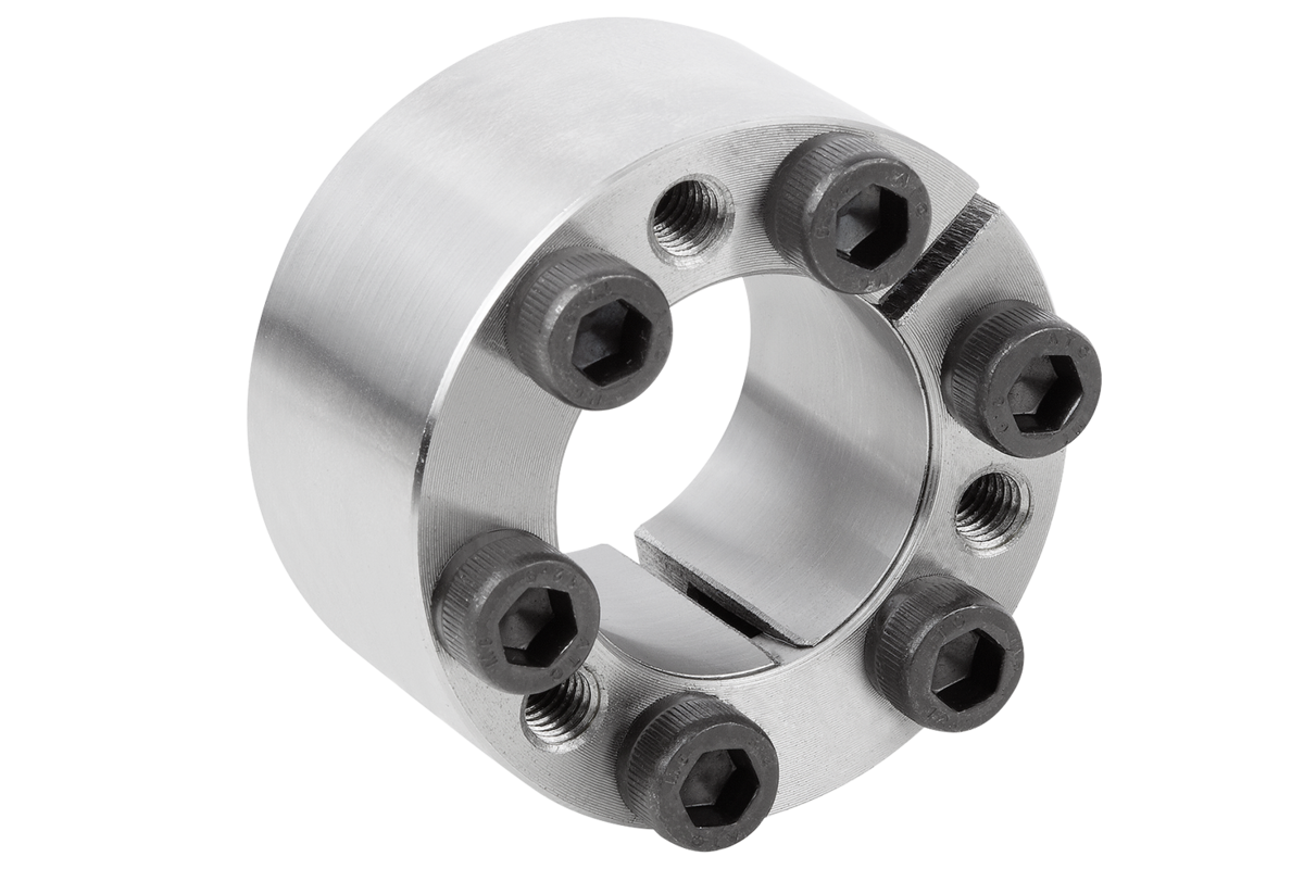 Montaje:Aplicar una capa ligera de aceite en las superficies cónicas del juego de dispositivo de sujeción y en los puntos de contacto del árbol y el cubo. No utilizar MoS2 ni grasa. Introducir el juego de dispositivo de sujeción en la base del cubo y deslizar en el árbol. Apretar el tornillo en cruz por etapas al par de apriete indicado.