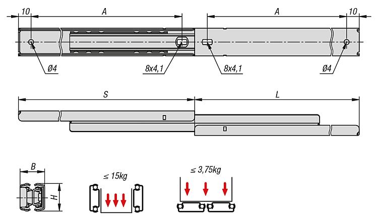 Bolas de acero inoxidable 1.4034. Versión:Carriles con acabado natural. Jaulas de bolas con acabado natural. Bolas con acabado natural.Indicación de pedido:Venta por pares.Indicación:En los carriles telescópicos con extensión completa, la carrera es similar a la longitud de montaje, con lo que se garantiza mayor comodidad y accesibilidad. La capacidad de carga dinámica de los carriles telescópicos indica la capacidad de carga máxima de una pareja de carriles telescópicos montados en vertical cuando se utiliza el recorrido de extensión completo. Las capacidades de carga indicadas se han determinado con una distancia entre carriles de 450 mm y se refieren al valor máximo con 10.000 ciclos.