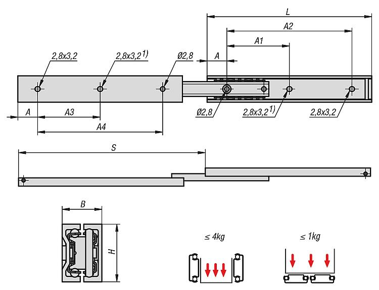 Tornillos recomendados: M 2,5.Rango de temperatura:De 5 °C a 35 °CVentajas:Marcha suave Gran estabilidad lateral gracias a una guía precisaIndicación sobre el dibujo: