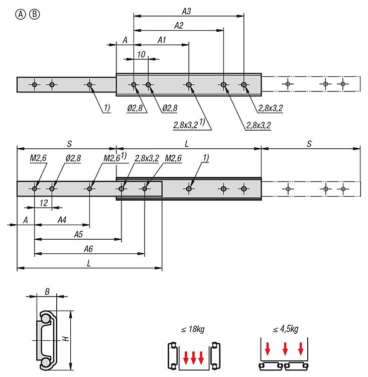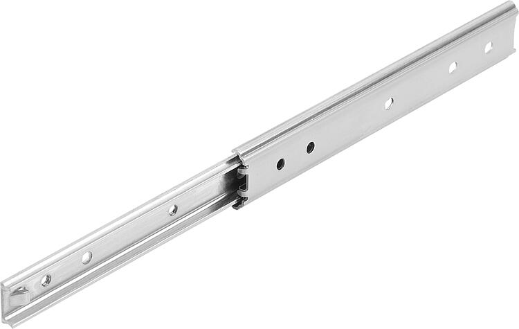 Guías telescópicas de acero inoxidable para montaje lateral, extensión parcial por ambos lados, capacidad de carga hasta 18 kg, forma B