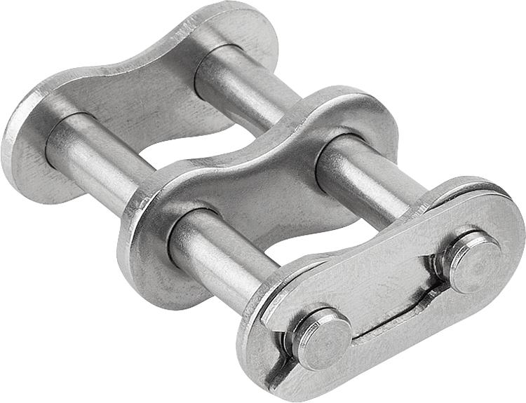 DescripciónMaterial:Acero inoxidable 1.4301. Indicación:Elemento de unión para cadenas de rodillos dobles según DIN ISO 606.