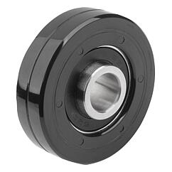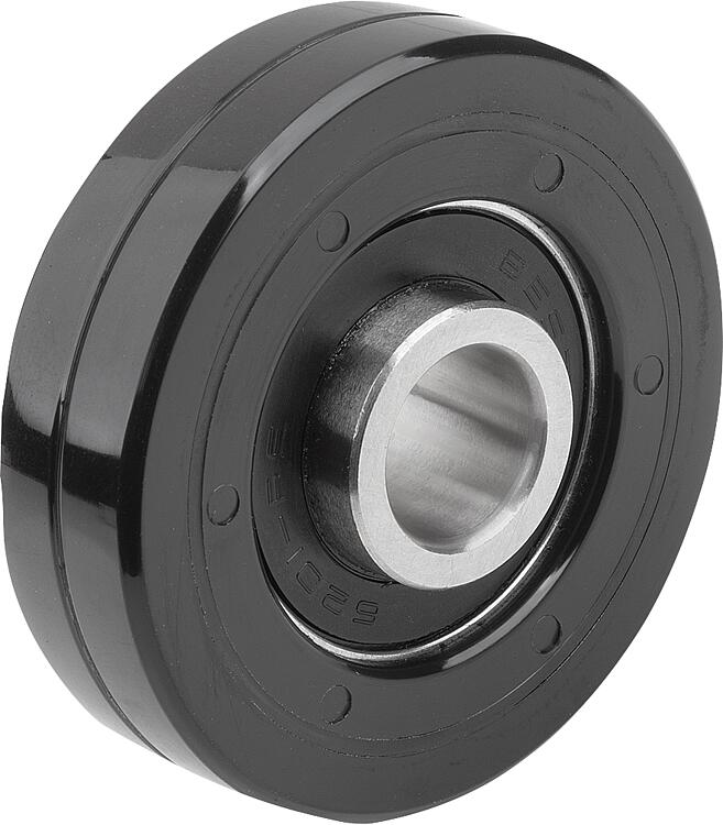 DescripciónMaterial:Superficie de rodadura de poliuretano (PUR). Rodamiento de acero.Versión:Superficie de rodadura marrón oscuro.Indicación:La superficie de rodadura está firmemente soldada sobre un rodamiento de bolas. La superficie de rodadura es de doble capa a partir de un diámetro D = 40 mm.